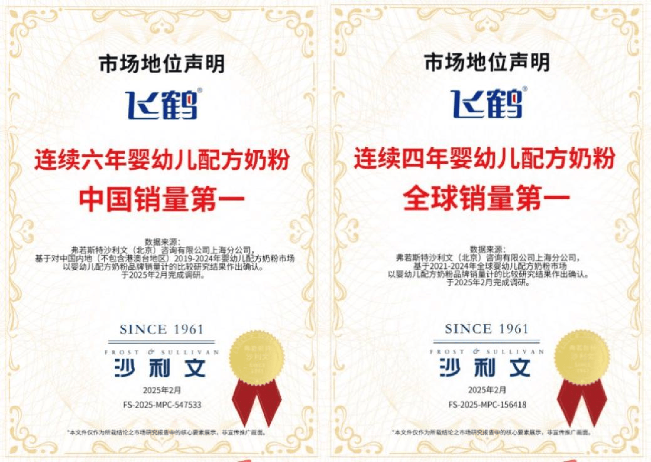 飞鹤连续六年蝉联中国婴配粉市场销量第一,连续四年位居全球婴配粉销量榜首