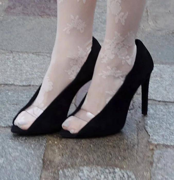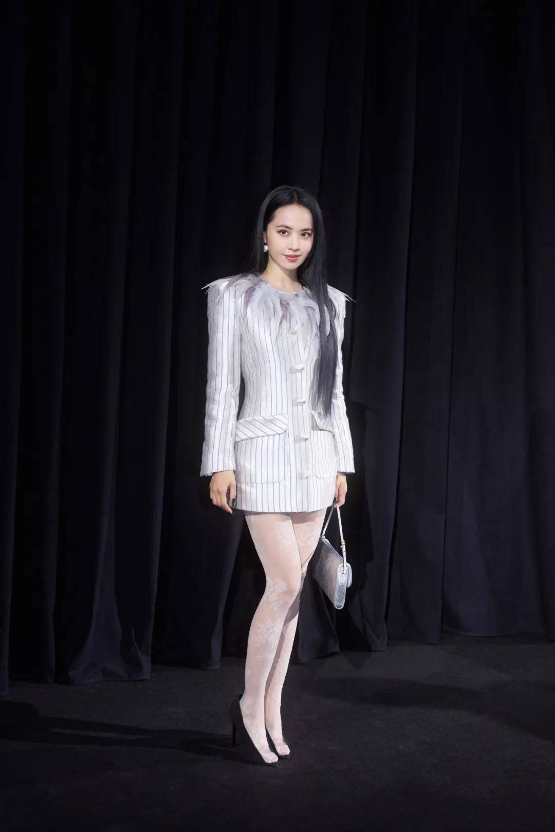 她身着白色修身竖条纹西装裙,领口处点缀藕粉色羽毛,为整体注入一丝法式优雅。白色蕾丝花纹长袜与黑色尖头高跟鞋形成碰撞,在复古格调中透出先锋质感。