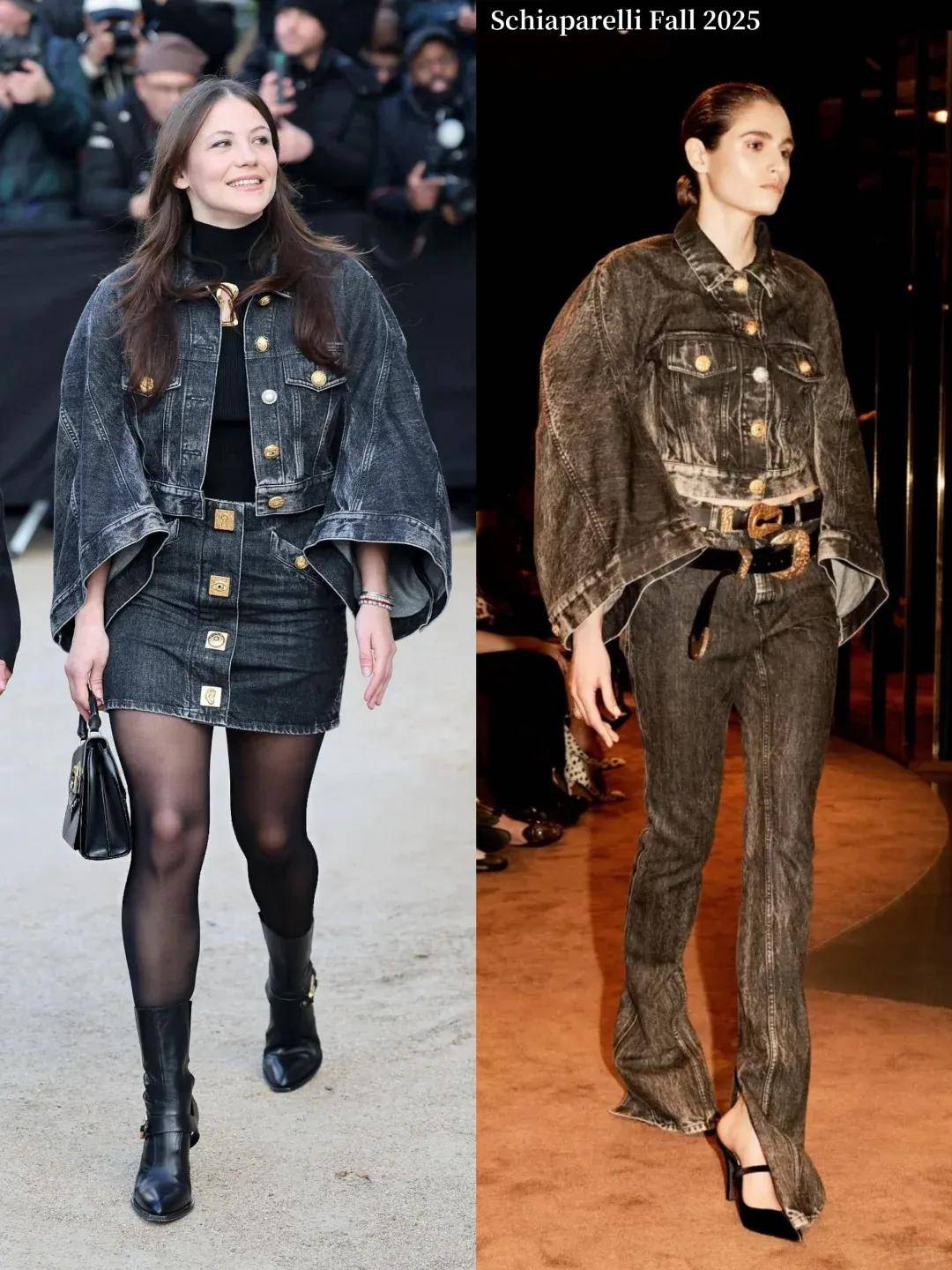 女儿Juliette以一身前卫的牛仔造型亮相:设计感牛仔外套配以宽大喇叭袖,下搭包臀牛仔短裙、黑与黑色短靴,肤色白皙,身材高挑,时髦又显气场。
