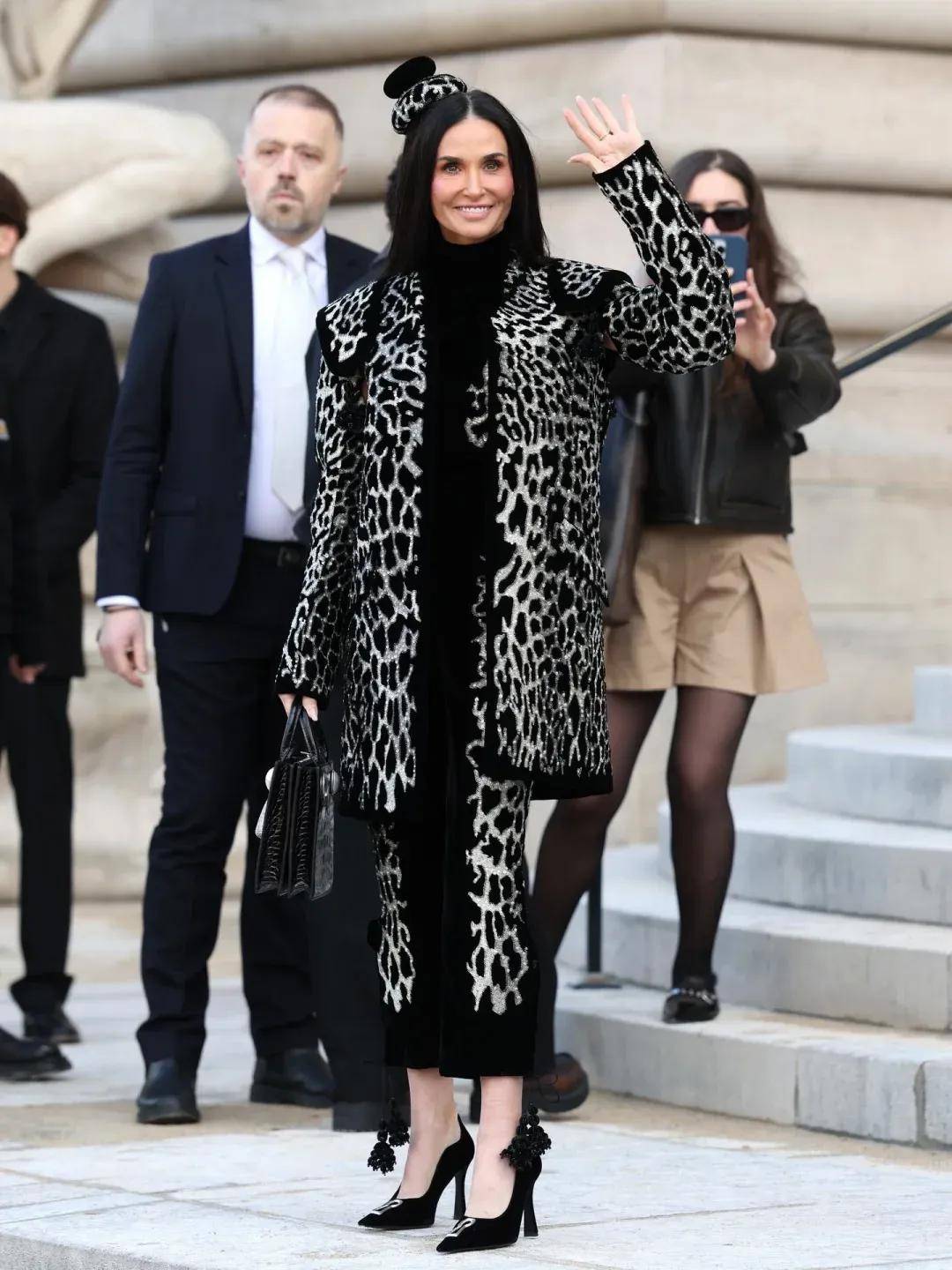 因《某种物质》再度引发讨论的Demi Moore,一身豹纹套装,以一种成熟、冷静的姿态坐在头排,与新一代时尚面孔形成微妙对照。