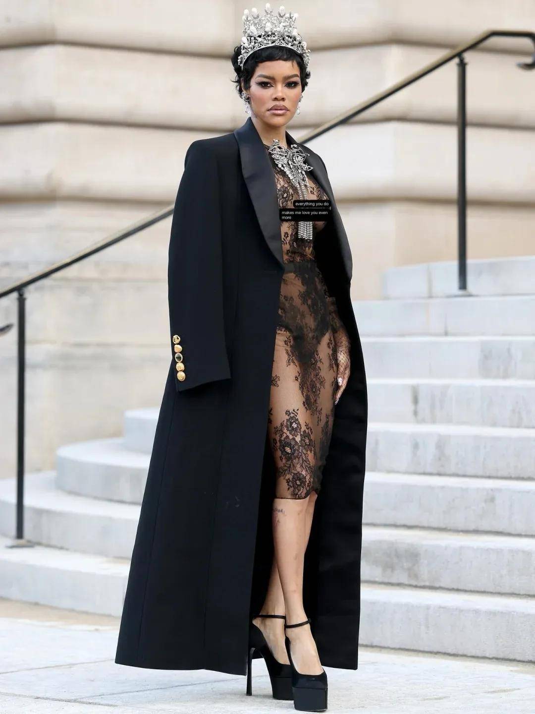 Rihanna无疑是全场的情绪锚点。她以压轴嘉宾身份登场,一身全黑造型把气场一整个拉满。虽被网友调侃是“迟到天后”,但在高定周的语境下,Rihanna的“迟到”也算是一种无需解释的时尚权力的展示。
