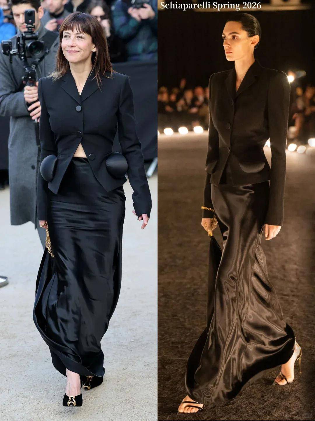 苏菲·玛索则全身黑色装扮,解开西装下摆纽扣,自信秀出腹肌线条,搭配黑色丝质长裙,脚踩黑金拼接高跟鞋。小面积金色点缀,巧妙打破全黑的沉闷,尽显奢华与高级质感。