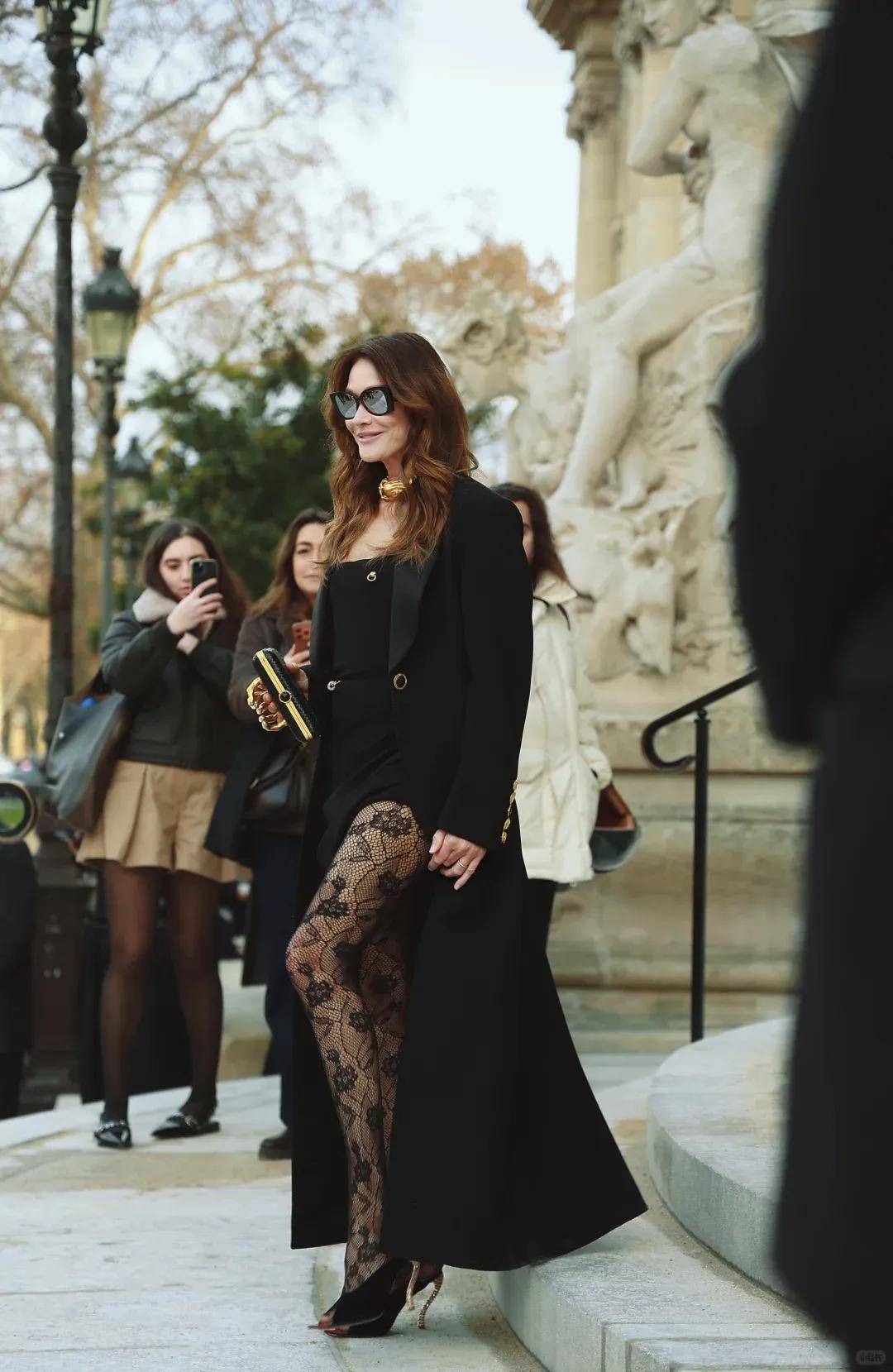 亮相Schiaparelli秀场的前法国卡拉·布吕尼以黑色不对称剪裁裙装搭配黑色蕾丝长袜的性感造型亮相,大秀修长,演绎了风情满满又不失酷帅的法式风格。